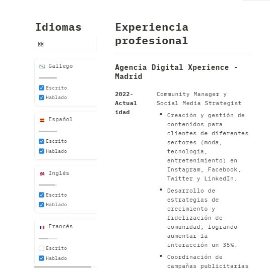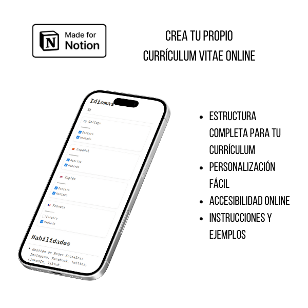 - Accesibilidad online: Comparte tu currículum directamente desde Notion sin necesidad de convertirlo a un archivo PDF.